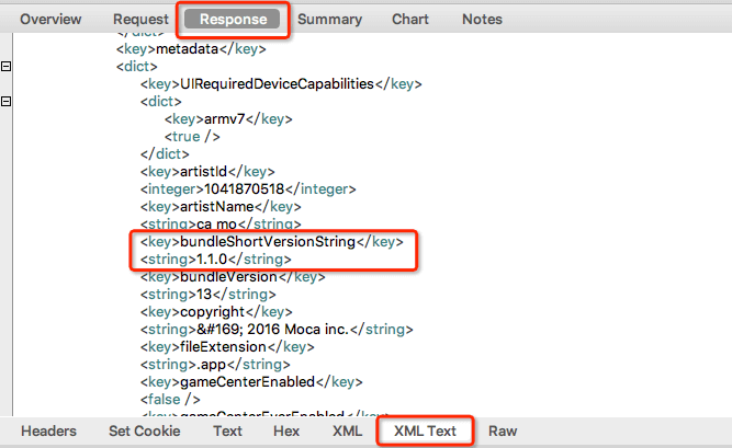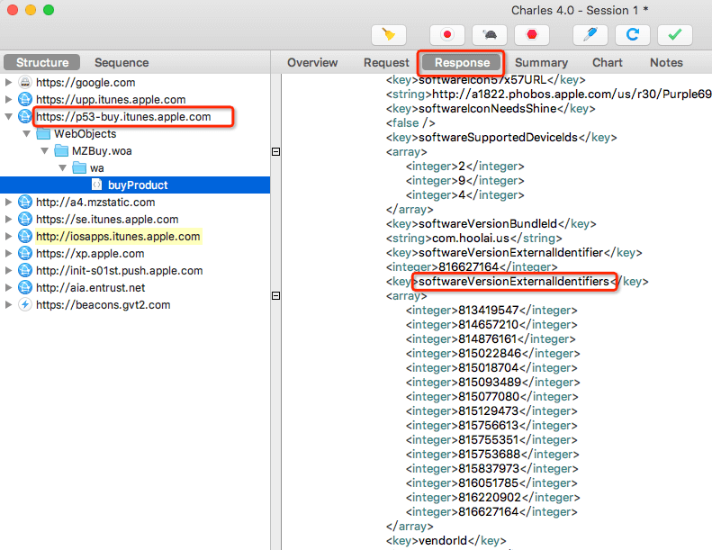 找到 p15-buy.itunes.apple.com URL开头为 /WebObjects/MZBuy.woa 的请求,点击选项卡上面的Response,就可以看到返回的相关数据。