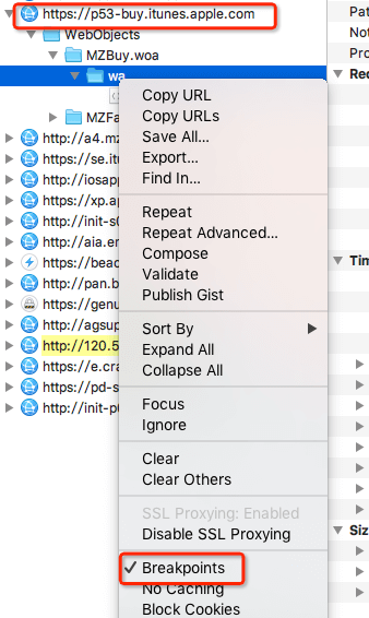 切换到Charles,找到对应的请求一级一级展开,在最后一个节点上右键然后选中 Breakpoints