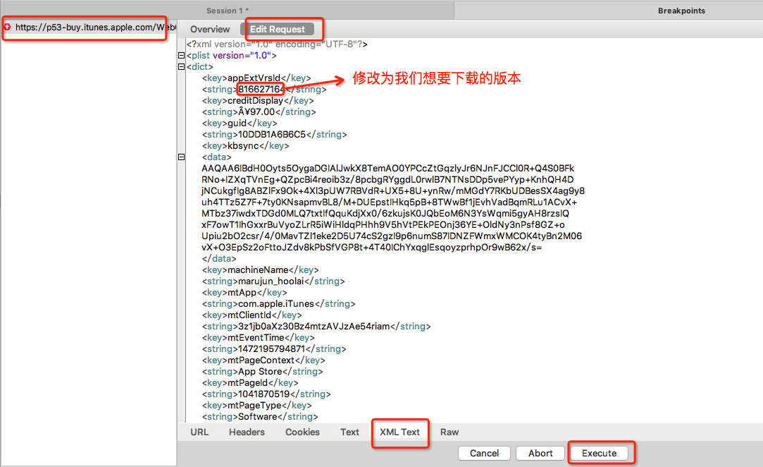 回到Charles后会出现Breakpoints的选项卡,点击请求显示 Edit Request 栏编辑 appExtVrsId 为需要下载的版本 ID。