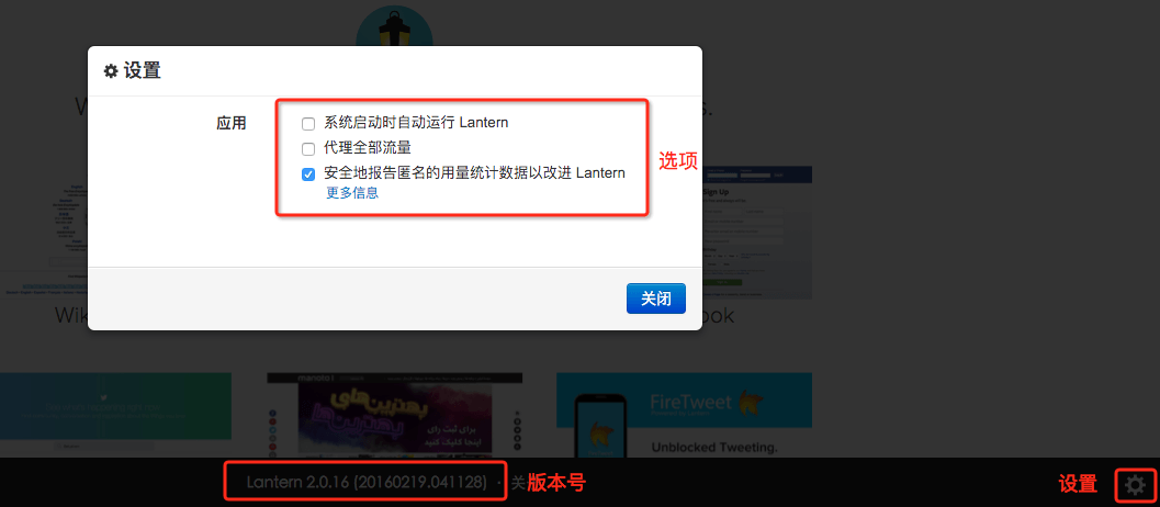 如果不希望开机自动运行, 则到web页面后点击右下角的齿轮, 去掉 系统启动时自动运行 Lantern