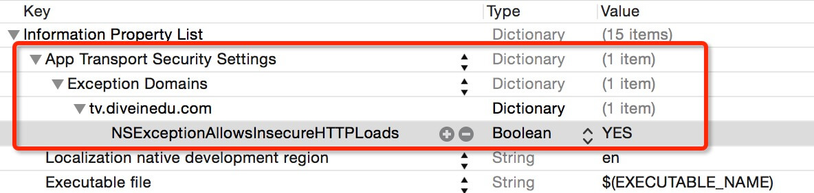 在iOS开发中,从Xcode7和iOS9开始,Apple提升了App的网络安全性,App默认只能进行对采用权威机构签名颁发证书的Web站点进行访问(信任的HTTPS),而自签名的证书的HTTPS站点也被列为属于例外,所以我们需要在App的Info.plist中单独为我们的域名设置 Exception Domains “白名单”,而不是打开 Allow Arbitrary Loads 全部放开,设置信息如下:
