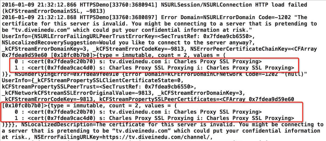 上面的代码能够验证服务器身份在没有使用代理的时候可以正常访问服务器的资源,但是一旦用户给手机网络设置使用了如Charle那样的HTTPS/SSL代理服务,则会出现服务器证书验证失败,SSL网络连接会断开,老板再也不用担心数据接口被人抓包或者代理给扒出来了.故达到防止中间人攻击的效果.