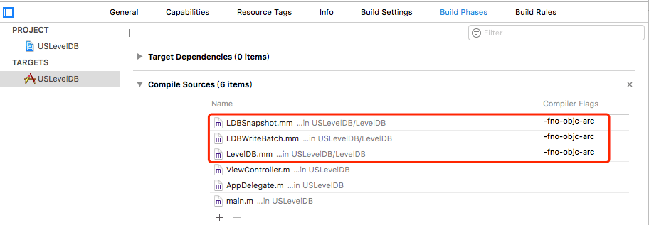 打开 Target -> Build Phases -> Compile Sources 找到 LevelDB.mm、LDBSnapshot.mm、LDBWriteBatch.mm 这3个文件