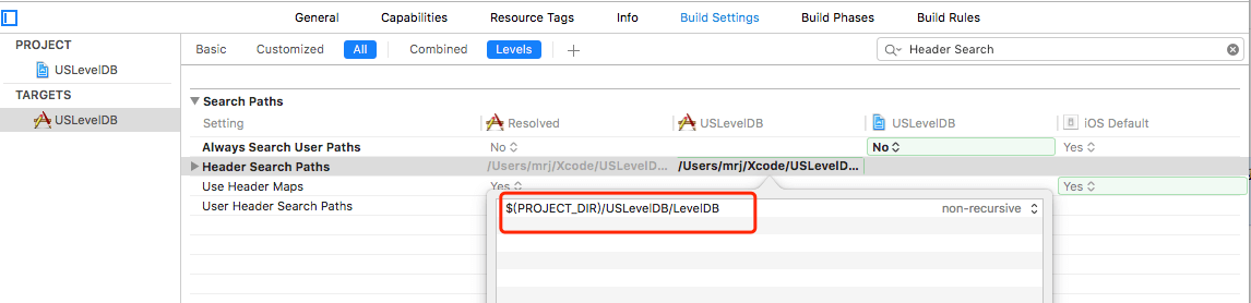 打开 Target -> Build Settings -> Header Search Paths 加入 LevelDB文件夹在项目中的路径。