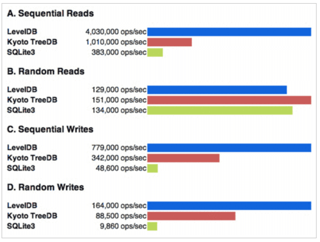 结果显示,在顺序读写和随机写上,LevelDB 在性能上都遥遥领先。
